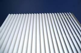 Rejilla de retorno para techos modulares. Esta construida con una serie de láminas paralelas fijas e inclinadas, unidas entre si por tubos de aluminio, esta especial disposición impide la visión a través de ella. Este modelo se fabrica en 2 versiones: